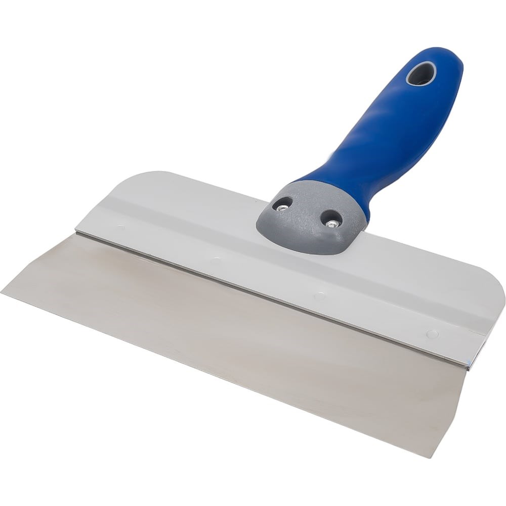 Шпатель предназначен для нанесения и выравнивания штукатурной смеси или шпаклевочного состава при проведении работ по отделке фасадов и интерьеров. Его рабочая часть изготовлена из нержавеющей стали, что обеспечивает прочность и защиту от коррозии. Благодаря наличию алюминиевой направляющей исключен изгиб полотна. Обрезиненная двухкомпонентная рукоятка не скользит в руке, обеспечивая надежный захват. Отверстие в рукоятке позволяет удобно расположить инструмент на хранение.