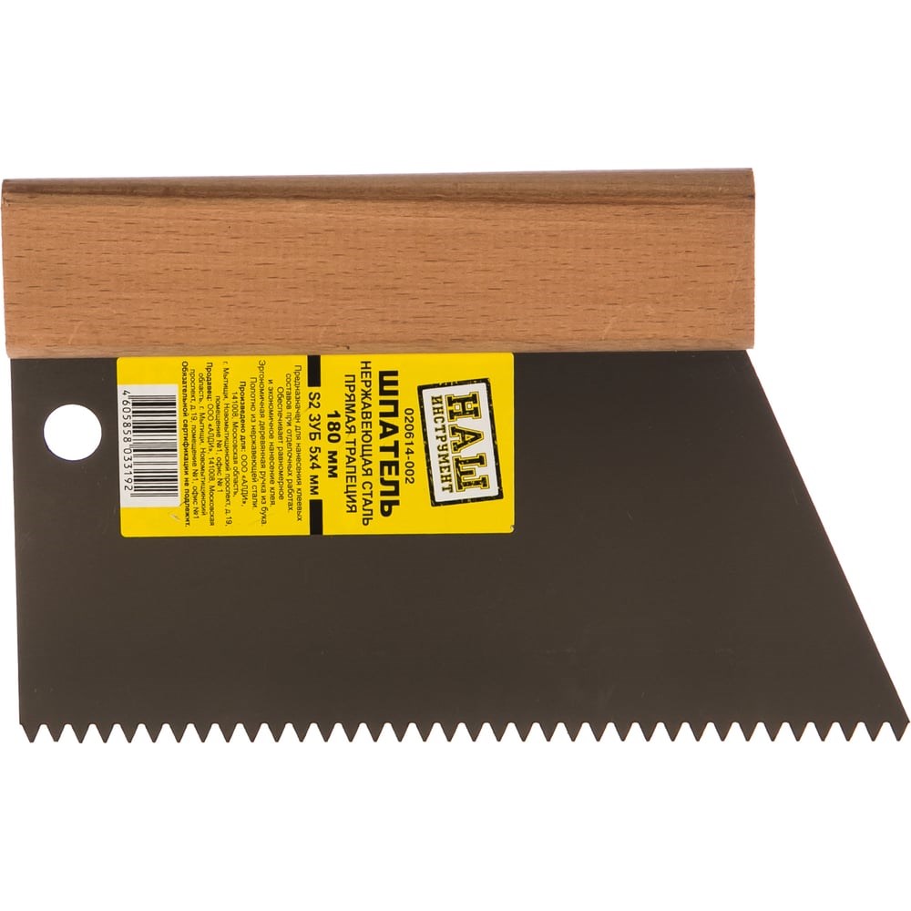 Шпатель нержавеющая сталь прямая трапеция НАШ ИНСТРУМЕНТ 180 мм S2 зуб 5х4мм/Р/ 020614-002 подойдет для нанесения на поверхность различных видов клея. Инструмент оснащен удобной рукояткой, которая упрощает удержание шпателя.