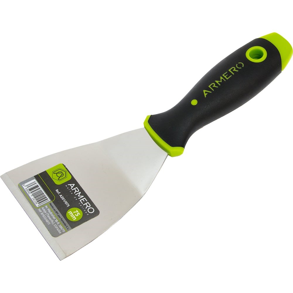 Шпатель-скребок из нержавеющей стали Armero 75 мм A201/075 предназначен для быстрой очистки различных поверхностей от износившихся лакокрасочных покрытий. Подходит для монтажа натяжных потолков, идеальный инструмент для заправки виниловых полотен натяжного потолка под все виды профилей.Изогнутое полотно выполнено из нержавеющей стали толщиной 1,2 мм, что обеспечивает долгую службу.Мягкая двухкомпонентная рукоятка не скользит в руке.