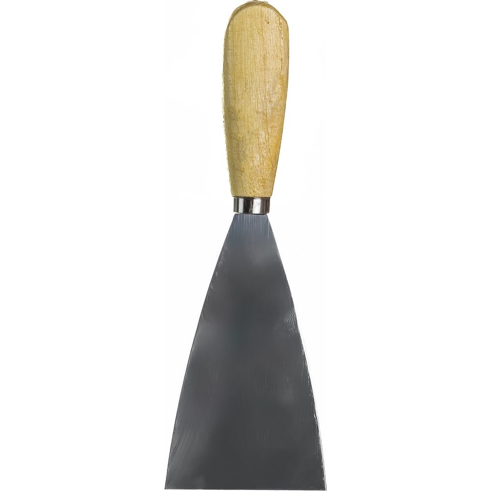 Шпатель-скребок изготовлен из углеродистой стали с односторонней заточкой кромки. Рукоятка выполнена из дерева. Длина лезвия составляет 70 мм.Лезвие изготовлено из углеродистой стали марки 50 и имеет толщину 0,7–1,25 мм. Поверхность лезвия отполирована до зеркального блеска. Рукоятка покрыта лаком.Этот шпатель предназначен для удаления шпаклёвки и краски с поверхностей.