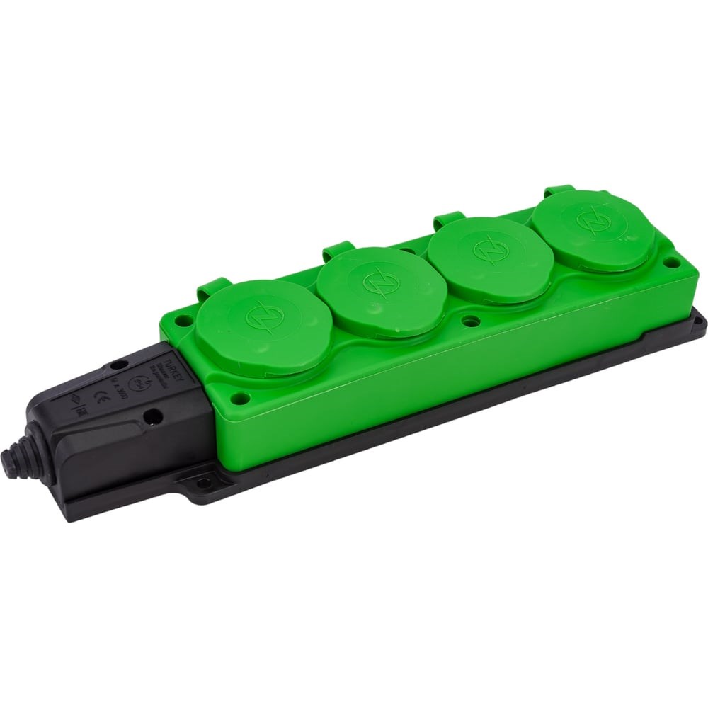Штепсельная колодка NE-AD 4-гнезда с крышкой, с заземлением, 16А, IP54 (каучук), Зеленый 4134 предназначена для подключения электрооборудования и электроинструментов в сложных эксплуатационных условиях мощностью до 3,6 кВт. Штепсельные колодки из синтетического каучука успешно используются: В разных отраслях промышленности (для подключения электрических станков или проведения профессионального освещения). На стройплощадках (при прокладке временных кабельных линий и установки бытовок). В бытовых условиях (для электроснабжения торговых киосков, при организации выставочных площадей). В личных подсобных хозяйствах (для подключения электрооборудования и электроинструментов) и т.д. Изделие подходит для эксплуатации в суровых условиях - на открытом воздухе или во влажных или запыленных помещениях - IP54.