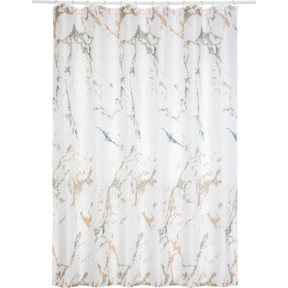 Штора для душа VIDAGE Nebbia 180x200 см, полиэстер, под мрамор 1327039 оснащена люверсами и утяжелителем (лента по нижней части). Допускается машинная стирка при 30 °C. Кольца в комплект не входят.