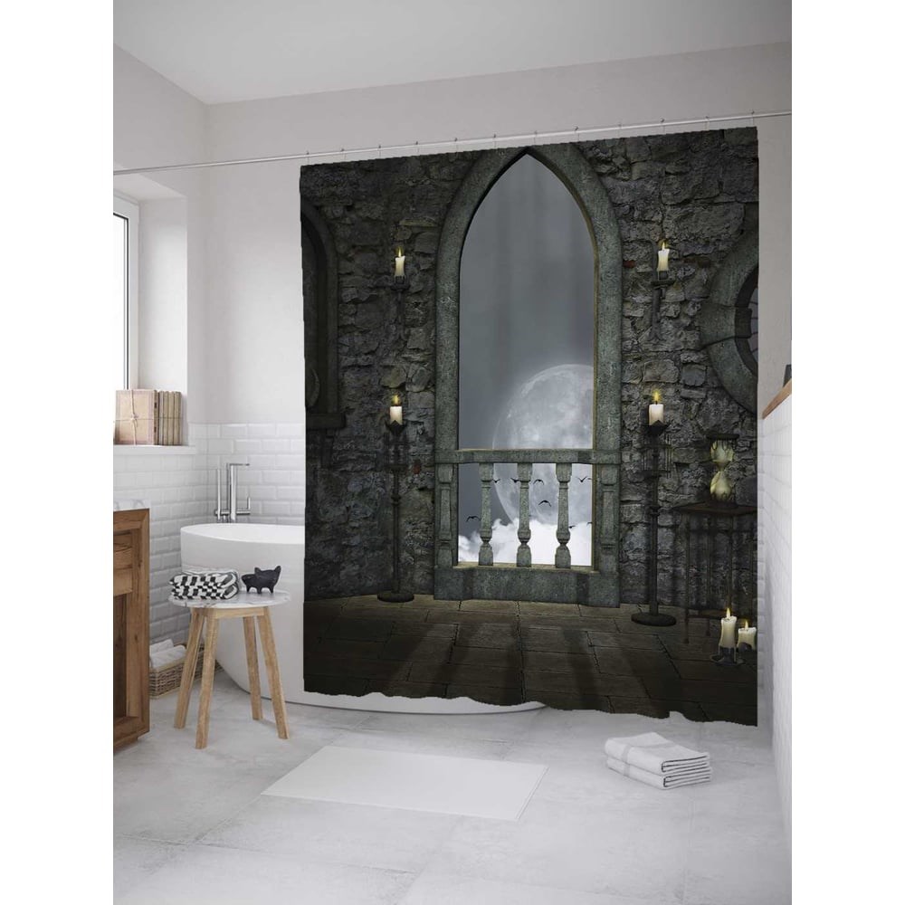В отличие от подобных изделий из ПВХ и силикона, занавеска в ванную, пошитая из полиэстера, выгодно отличается красивым внешним видом, прочностью и длительным сроком службы. Водонепроницаемая ткань плотностью 80 г/м2 украшена стильным разноцветным принтом - нанесенная краска не боится контакта с горячей водой и не выцветает с течением времени. В комплект шторы для ванной размером 180х220 см входит 12 крючков, для которых уже подготовлены все нужные отверстия. Стиль: готика. Принт: Луна в арке замка. Цвет: черный, серый. Рисунок: пейзаж. Теги: готика, замок, архитектура, мрачный, гротеск, средневековье, полнолуние. При покупке нужно учесть, что фактический размер изделия может отличаться от заявленного в пределах не более 5 см.