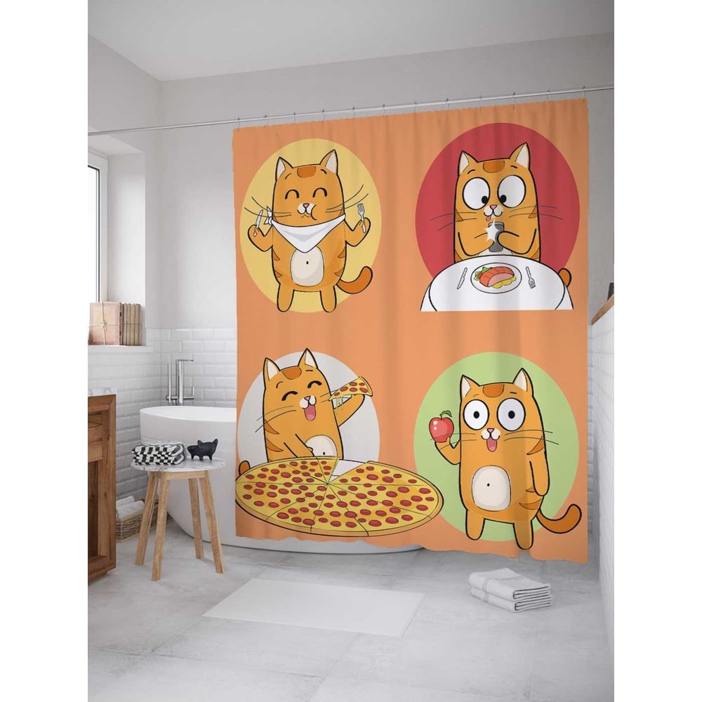 В отличие от подобных изделий из ПВХ и силикона, занавеска в ванную, пошитая из полиэстера, выгодно отличается красивым внешним видом, прочностью и длительным сроком службы. Водонепроницаемая ткань плотностью 80 г/м2 украшена стильным разноцветным принтом - нанесенная краска не боится контакта с горячей водой и не выцветает с течением времени. В комплект шторы для ванной размером 180х220 см входит 12 крючков, для которых уже подготовлены все нужные отверстия. Стиль: наив. Принт: Стиль кота. Цвет: красный, оранжевый, белый. Рисунок: звери. Теги: кот, еда, пицца. При покупке нужно учесть, что фактический размер изделия может отличаться от заявленного в пределах не более 5 см.