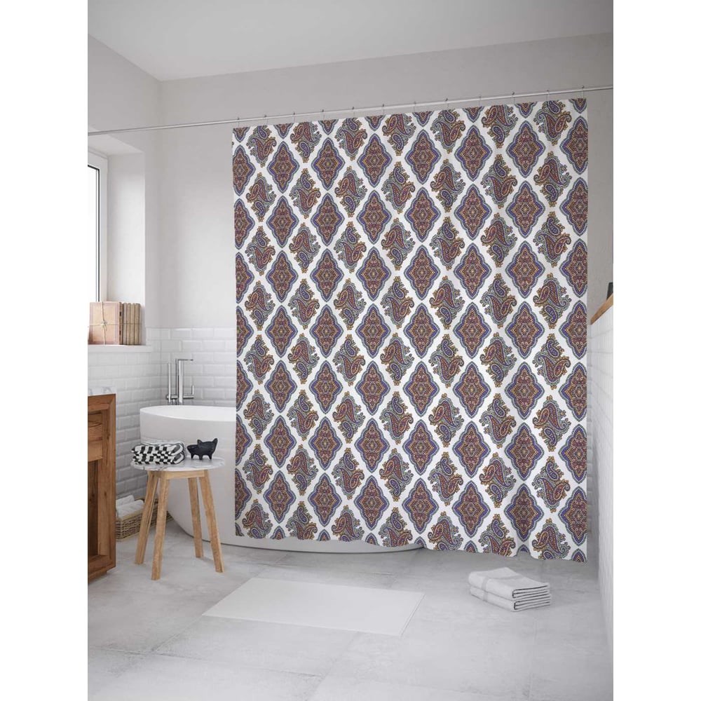 В отличие от подобных изделий из ПВХ и силикона, занавеска в ванную, пошитая из полиэстера, выгодно отличается красивым внешним видом, прочностью и длительным сроком службы. Водонепроницаемая ткань плотностью 80 г/м2 украшена стильным разноцветным принтом - нанесенная краска не боится контакта с горячей водой и не выцветает с течением времени. В комплект шторы для ванной размером 180х220 см входит 12 крючков, для которых уже подготовлены все нужные отверстия. Стиль: цветочный. Принт: Строгие мысли. Цвет: темно-бежевый, серый, белый. Рисунок: орнамент. Теги: цветы, лепестки, узоры, орнамент, паттерн, текстура, повтор. При покупке нужно учесть, что фактический размер изделия может отличаться от заявленного в пределах не более 5 см.