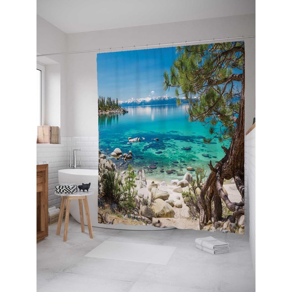 В отличие от подобных изделий из ПВХ и силикона, занавеска в ванную, пошитая из полиэстера, выгодно отличается красивым внешним видом, прочностью и длительным сроком службы. Водонепроницаемая ткань плотностью 80 г/м2 украшена стильным разноцветным принтом - нанесенная краска не боится контакта с горячей водой и не выцветает с течением времени. В комплект шторы для ванной размером 180х220 см входит 12 крючков, для которых уже подготовлены все нужные отверстия. Стиль: фотостиль. Принт: Вид с жаркого пляжа. Цвет: голубой, зеленый, серый. Рисунок: пейзаж. Теги: камни, море, горы. При покупке нужно учесть, что фактический размер изделия может отличаться от заявленного в пределах не более 5 см.
