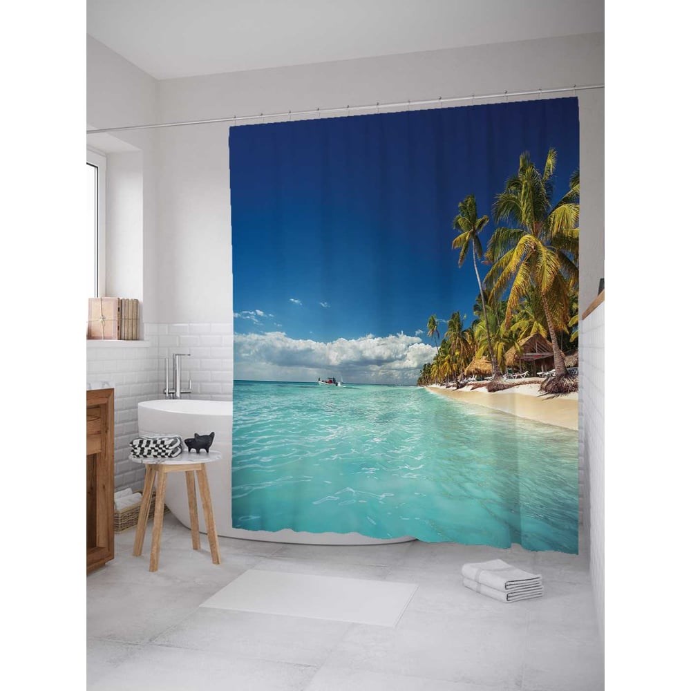 В отличие от подобных изделий из ПВХ и силикона, занавеска в ванную, пошитая из полиэстера, выгодно отличается красивым внешним видом, прочностью и длительным сроком службы. Водонепроницаемая ткань плотностью 80 г/м2 украшена стильным разноцветным принтом - нанесенная краска не боится контакта с горячей водой и не выцветает с течением времени. В комплект шторы для ванной размером 180х220 см входит 12 крючков, для которых уже подготовлены все нужные отверстия. Стиль: фотостиль. Принт: Время релакса. Цвет: синий, зеленый, бежевый. Рисунок: морская тематика. Теги: море, пальмы, корабль, песок. При покупке нужно учесть, что фактический размер изделия может отличаться от заявленного в пределах не более 5 см.
