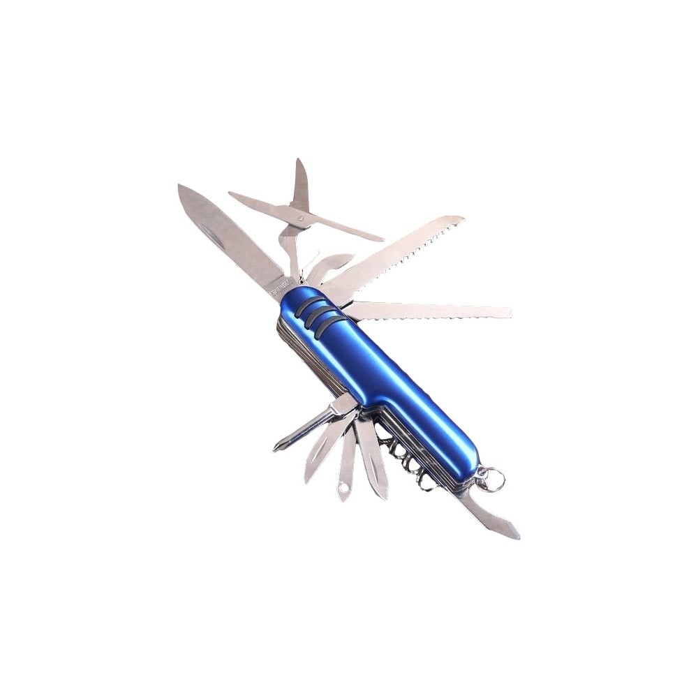 Швейцарский нож Мастер К 11 функций, синий 486463 подходит для использования в походе, на пикнике. Инструменты изготовлены из прочной и качественной стали, что обеспечивает долгий срок службы. Все рабочие элементы складываются в рукоятку, что гарантирует безопасность во время хранения и транспортировки. Предусмотрено специально кольцо для подвешивания на ключ или рюкзак.