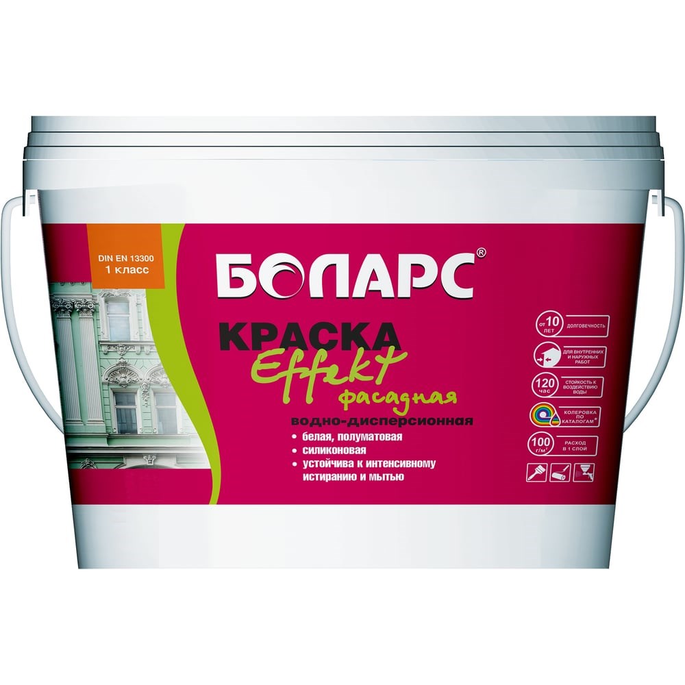 Силиконовая краска БОЛАРС Effect 2100, 7 кг 00000003893 служит для обработки помещений и фасадов зданий (в том числе фасадов, утепленных минеральной ватой), которые находятся под воздействием сильной влажности и больших нагрузок. Подходит для применения на старых и новых объектах, архитектурных памятниках, фактурных покрытиях из штукатурки. Продукт обладает отличной паропроницаемостью. Созданное покрытие не боится активного истирания и мытья.