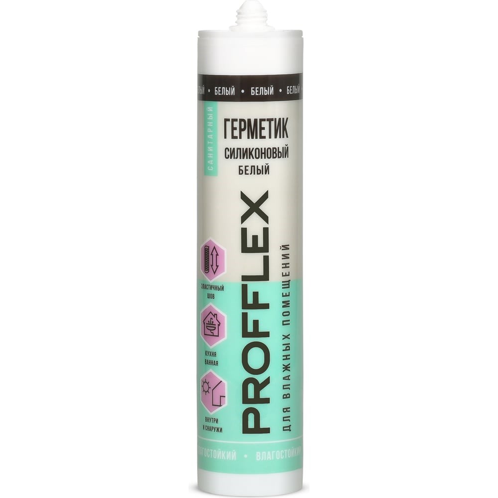 Герметик силиконовый санитарный белый PROFFLEX 199013 - силиконовый однокомпонентный уплотняющий герметик с кислой системой отверждения. Идеально подходит для работ во влажных помещениях. Содержит антигрибковые добавки, предотвращающие появление плесени. Разработан с учетом специальных технологий бактерицидного действия.СВОЙСТВАТемпература применения от +5˚С до +40˚СТермоустойчивость от -40˚С до +100˚СДлительное время сохраняет эластичные свойстваОбладает отличной адгезией к стеклу, эмали, керамике, дереву, металлу, эмалированным поверхностям.Не стекает в вертикальных швахУстойчив ко всем основным моющим средствамУстойчив к ультрафиолетуУстойчив к появлению плесени (грибка)Отличная адгезия к непористым поверхностямПри отверждении выделяет уксусный запахСФЕРА ПРИМЕНЕНИЯДля уплотнения и герметизации раковин, ванн, душевых кабин, соединений в бассейнах, водоснабжении, дренаже, ПВХ-трубах.Для заполнения щелей в санитарных целяхГерметизация между раковиной и стеной, вокруг раковин и керамических цоколей