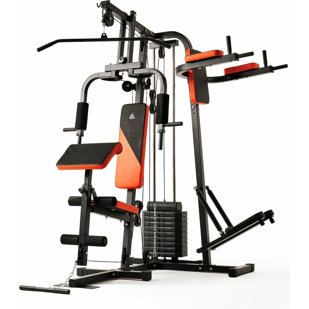Силовой комплекс DFC D7002 предназначен для прокачки всех групп мышц: рук и верхнего плечевого пояса, спины, грудных мышц, пресса, ног. Позволяет выполнять силовые упражнения с разным функционалом для наилучшей эффективности тренировки. Сиденье и спинка с плотной обивкой черного цвета с оранжевыми вставками зафиксированы для комфортного выполнения упражнений. Парта для бицепса из той же ткани регулируется по высоте на 3 уровня. Комплекс не требует дополнительных снарядов – он полностью автономный. Комплект входит весовой стек массой 45 кг: 9 пластин по 4,5 кг и верхняя пластина 5 кг. Ролики на подшипниках обеспечивают плавное движение. Стальной трос толщиной 4 мм в защитной оплетке также гарантирует безопасность при выполнении упражнений.
