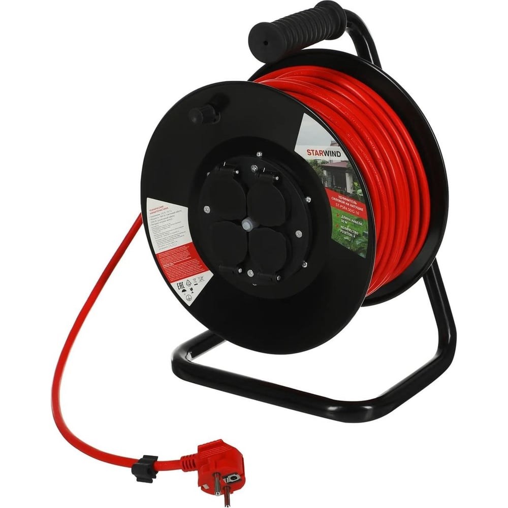 Силовой удлинитель STARWIND ST-PSR4.50/G-16 3x2.5 кв.мм, 4 розетки, 50м, ПВС, 16A, катушка, оранжевый 1781490