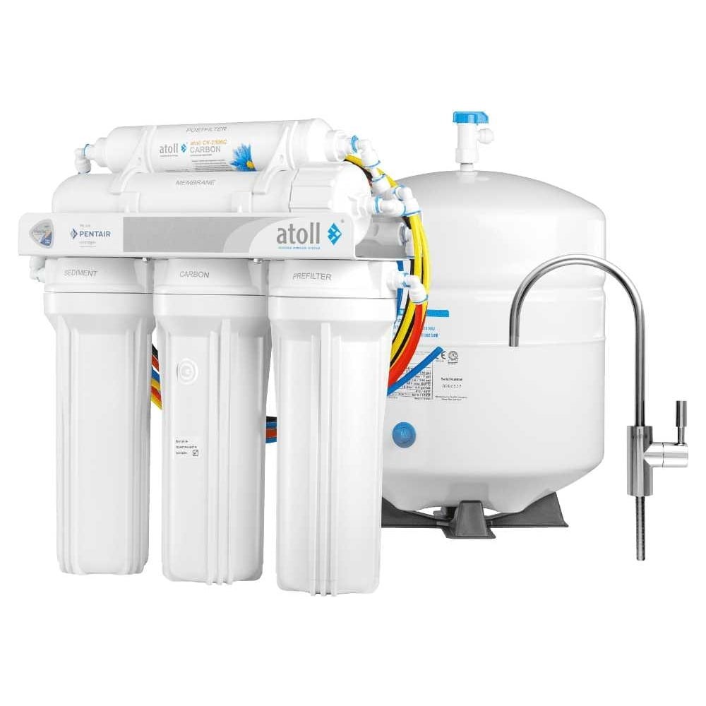 Atoll A-575 STD – это система обратного осмоса повышенной производительности (75 GPD, 195 л/сутки) для очистки холодной питьевой воды (5 ступеней очистки). Процесс фильтрации на основе полупроницаемости полиамидной тонкопленочной мембраны исключает применение химических веществ.Три ступени очистки картриджами:Pentair (Pentek) P5 – механической очистки. Задерживает частицы песка, грязи и прочие загрязнения крупнее 5 мкм;Pentair (Pentek) GAC-10 (гранулированный активированный уголь) – от хлорорганических примесей. Удаление из воды хлора, улучшение органолептических свойств воды;Pentair (Pentek) P1 – механической очистки. Служит для удаления грязи и нерастворимых частиц крупнее 1 мкм.Вода после первых трех ступеней очистки проходит следующие две:обратноосмотической полупроницаемой мембраной Filmtec BW30-1812-75 – основная ступень. Производит очистку от примесей тяжелых металлов, солей жесткости, органических и неорганических соединений, бактерий и вирусов;постфильтром CK-2586C на основе порошкового активированного угля. Улучшает вкус запах воды.