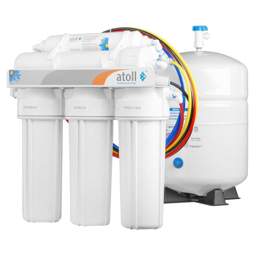Внимание! В комплект данного фильтра не входит питьевой кран! Атолл Патриот A-550 без питьевого крана — это система обратного осмоса для очистки холодной воды без питьевого крана. Процесс фильтрации на основе полупроницаемости полиамидной тонкопленочной мембраны исключает применение химических веществ. Вода проходит пять ступеней очистки отечественными фильтрующими элементами Атолл: Префильтр механической очистки atoll МП-5В. Задерживает частицы песка, грязи и прочие загрязнения крупнее 5 мкм; Сорбционный префильтр из гранулированного активированного угля atoll Патриот GAC-10 — от хлора и органических примесей; Префильтр механической очистки atoll МП-1В. Задерживает частицы песка, грязи и прочие загрязнения крупнее 1 мкм; Полиамидной тонкопленочной мембраной модели Атолл 1812-50. Производит очистку от примесей тяжелых металлов, органических и неорганических соединений, бактерий и вирусов; Постфильтром CK-2586C на основе порошкового активированного угля. Улучшает вкус, запах воды. Префильтры и постфильтр необходимо заменять с периодичностью раз в 6 месяцев, мембрану — 1 раз в 2 года. Срок службы элементов зависит от качества исходной воды. В комплект фильтра обратного осмоса Atoll A-550 Патриот также входят накопительный бак, монтажные принадлежности, колбы для фильтров и ключ для их снятия.
