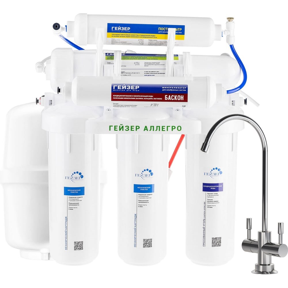 Система обратного осмоса с баком Гейзер Аллегро М обеспечивает очистку водопроводной воды до высшего питьевого качества с возможностью минерализации. Подходит для очистки очень жесткой воды. В комплект входит минерализатор «Баскон» для насыщения очищенной воды полезными солями кальция и магния до оптимального уровня жесткости воды — 1–1,5 мг–экв/л. Кран с двумя вентилями обеспечивает подачу воды с минералами (если вы хотите выпить стакан воды, обогащенной полезными микроэлементами) или без них (для приготовления чая, кофе). Вкус напитков, приготовленных на абсолютно чистой воде гораздо богаче и ароматнее. ЭТАПЫ ОЧИСТКИ ВОДЫ: 1 и 3 ступени очистки: осадочные картриджи РР 5 - 10SL — удаляют нерастворимые частицы размером до 5 мкм (ржавчина, взвеси); 2 ступень: CBC 10 - 10SL — карбон-блок из высококачественного кокосового активированного угля пористостью 10 мкм. Ресурс 6 – 12 мес. в зависимости от качества воды. Обратноосмотическая мембрана Geyser 1812-50 GPD — удаление всех примесей, включая бактерии и вирусы. Ресурс 1 – 3 года (зависит от качества воды). Угольный постфильтр — улучшает вкусовые качества воды. Ресурс 12 мес. Минерализатор Баскон — обогащает отфильтрованную воду микроэлементами. Ресурс 6 мес (1500л). Минимальное рабочее давление 3 атм. Производительность до 200 л/сутки Объем бака 12 л. (объем воды в накопительном баке составляет 40-70% его объема, в зависимости от давления в подводящем водопроводе). Срок службы 10 лет