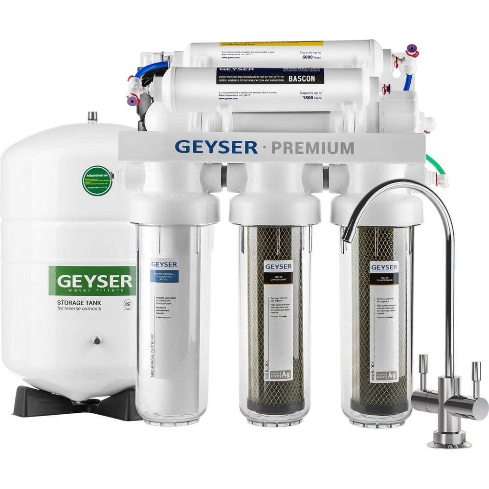 Система обратного осмоса Гейзер Премиум-П с помпой 20052предназначена для глубокой очистки воды от таких примесей как: железо, бактерии, вирусы, хлорорганические и органические примеси, хлор, тяжелые металлы, нитраты, механические частицы, избыток солей жесткости. Система корректирует минеральный состав воды, что делает её абсолютно чистой и безопасной, по качеству сравнимой с талой водой горных ледников. На блоке предочистки (1 механический и два угольных картриджа МИКС БЛОК) задерживаются механические примеси (ржавчина, ил, песок, окалина и т.д.), хлор и хлорорганические соединения, благодаря чему продлевается срок службы мембраны. Основная очистка происходит на обратноосмотической мембране Aquaporin, которая задерживает большинство неорганических соединений и примесей, бактерий и вирусов. Угольный постфильтр предназначен для кондиционирования воды, поступающей из накопительного бака. Минерализатор Баскон обогащает воду полезными минеральными солями. Ресурс – до 1500 л (патент № 2212378). Стильный кран с двумя вентилями позволяет потребителю получить два типа воды: минерализованная, с оптимальным составом для питья; очищенная без минерализации - содержит наименьшее количество примесей и в лучшей степени раскрывает аромат чая и кофе. Так же рекомендуется для приготовления обедов. Помпа позволяет использовать фильтр при давление от 1 атм. - система подходит для установки в загородных домах с низким давлением в магистрали водоснабжения.