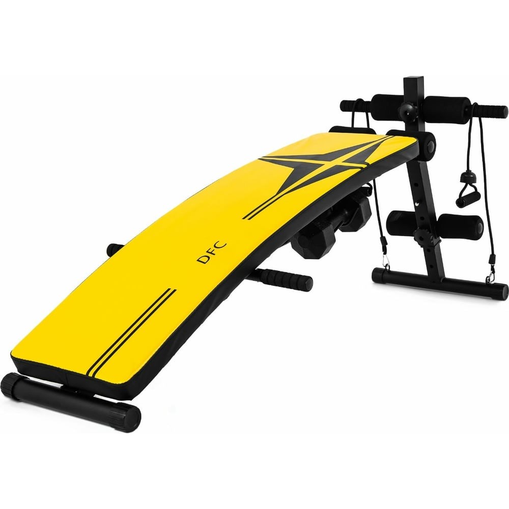 Скамья для пресса с гантелями и эспандерами DFC D102RY предназначена для домашнего использования. Изогнутая поверхность, складная модель В комплекте 2 гантели по 1,5 кг каждая и 2 эспандера Удобные рукоятки для упора Надежная стальная конструкция Удобные валики Регулируемые угол наклона и высота скамьи