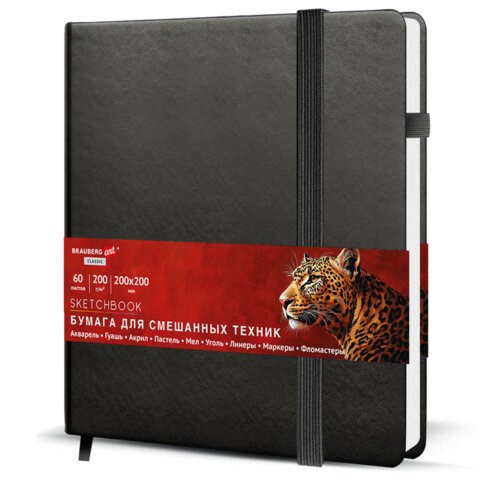 Скетчбук для смешанных техник MixMedia, 200 г/м2, 200х200 мм, 60 л., КОЖЗАМ, резинка, BRAUBERG ART CLASSIC, 116970