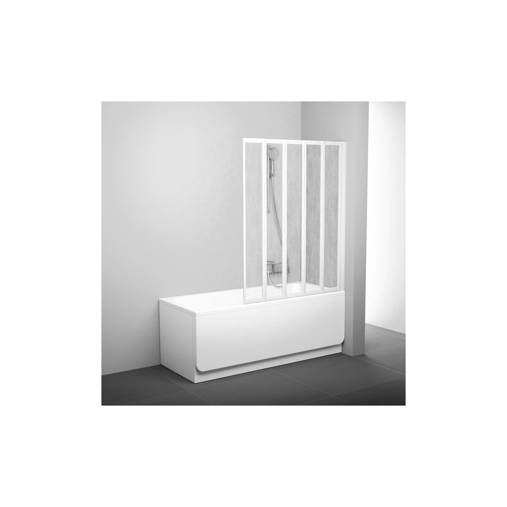 Шторка RAVAK VS5 белая, Rain, Supernova 00000017954 состоит из пяти подвижных частей, которые полностью складываются вовнутрь ванны. Подходит для прямоугольных ванн RAVAK с ровным передним бортом (Classic, Sonata, Vanda II и Lilia) или для какой-либо классической прямоугольной ванны с ровным передним бортом. Витраж изготовлен из пластика Rain.