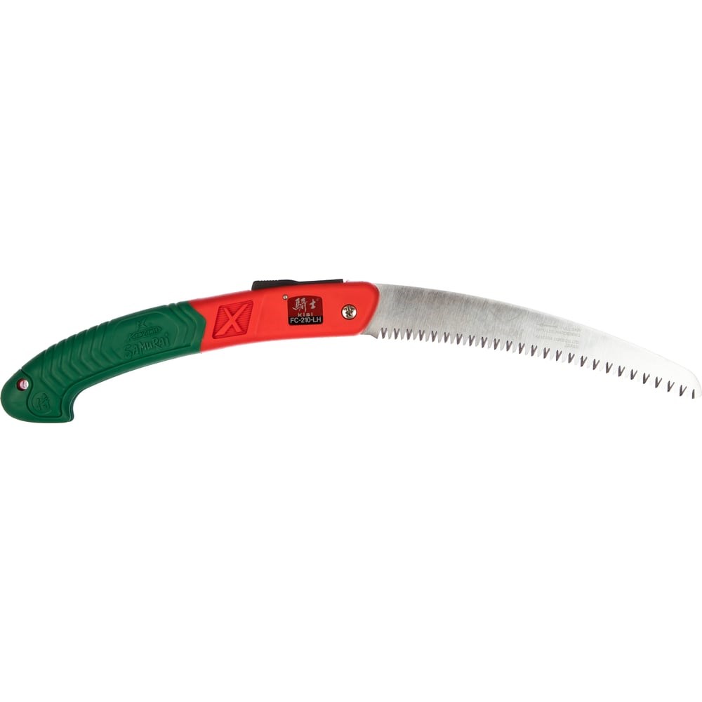 Пила складная с фиксатором изогнутое полотно SAMURAI FC-210-LH применяется для распила сухой древесины и небольших деревьев, обрезки ветвей любых размеров. Рабочая часть изготовлена из инструментальной хромированной стали, обеспечивающей инструменту прочнось и износоустойчивость. Зубья прошли заточку в трех плоскостях и закалку током, имеют максимальную остроту, способны качественно производить обратный рез. Пила особенно эффективна при работе выше уровня плеча, чему способствует изогнутая форма полотна. Рукоятка имеет эргономичную форму и удобно ложится в руку. Шаг зубьев - 4 мм.