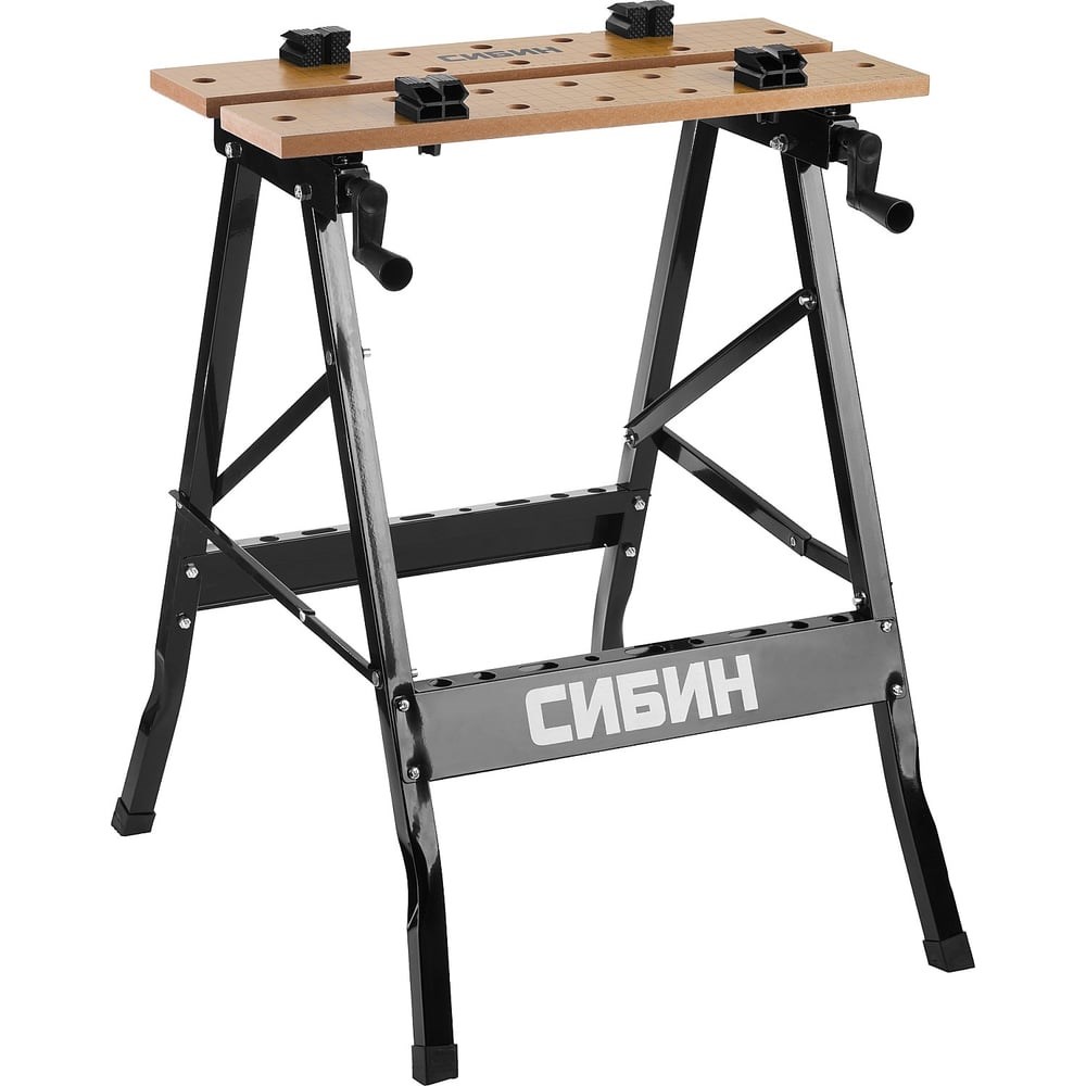 Столярный верстак СИБИН складной 38723 состоит из двух частей (подвижная и неподвижная) и используется при выполнении небольших столярных и слесарных работ в мастерской, гараже. Положение подвижной части можно регулировать с помощью двух вращающихся рукояток. Рабочий стол оснащен специальными фиксаторами, отверстиями, которые позволяют закреплять, зажимать заготовки для их дальнейшей обработки с высокой точностью.