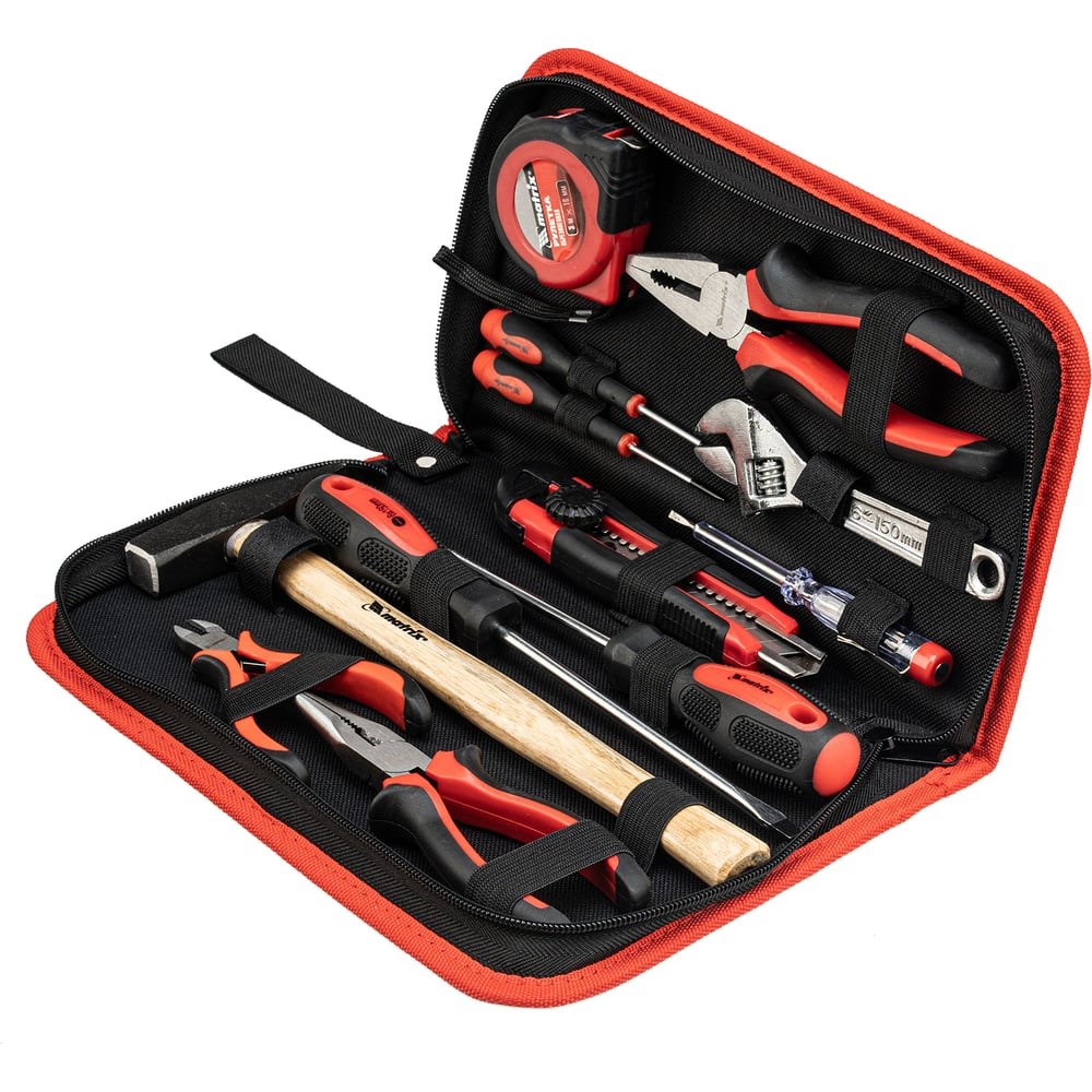 Набор Matrix 13562, 12 предметов, будет полезен как частным мастерам, так и профессионалам для проведения слесарно-монтажных работ. Он включает отвертки для монтажа/демонтажа резьбовых соединений, в том числе и мелких, разводной ключ для болтов и гаек, нож для резки плотных материалов, рулетку для проведения замеров, молоток, кусачки, и тестер напряжения.