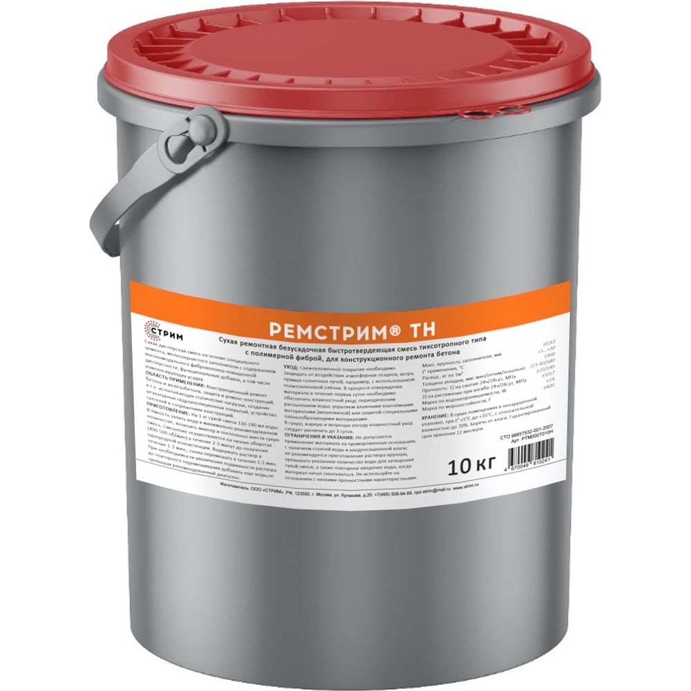 Смесь для ремонта бетона СТРИМ Ремстрим ТН с фиброй, 10 кг РТМ00ТН0010 на основе специального цемента, мелкозернистого заполнителя с содержанием высокомодульного фиброволокна повышенной дисперсности, функциональных добавок, в том числе компенсирующих усадку. При затворении водой материал образует пластичный тиксотропный состав с высокой адгезией к бетону и металлу. Толщина укладки 3-40 мм. Локальный ремонт - ≤80 мм.