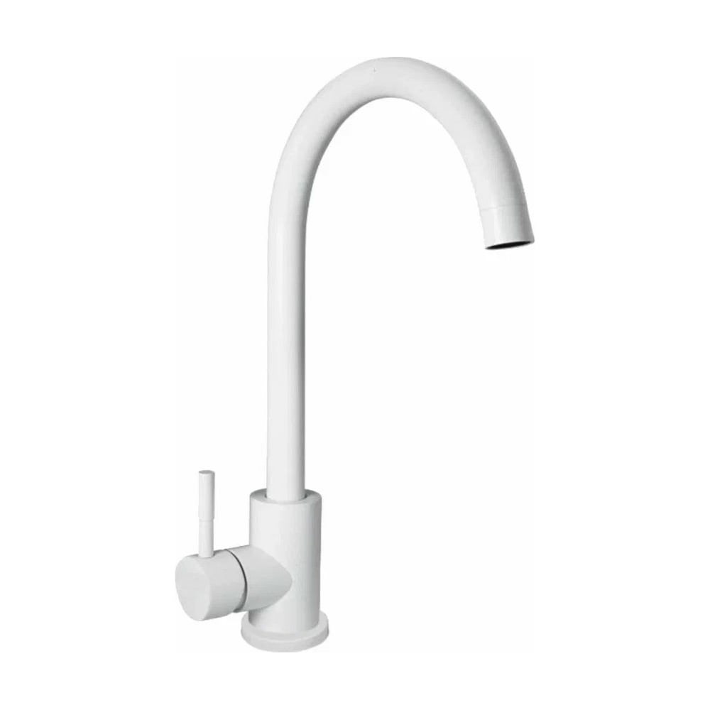Смеситель для кухни АНТЕЙ®, серия Булат - Корпус: нержавеющая сталь (SUS 304) - Цвет: белый - Картридж: ø35 мм, с керамическими пластинами - Излив: высокий, поворотный - Высота (корпус + излив): 374 мм - Аэратор: пластиковый, съемный, внутр. резьба Ø22мм В комплекте: гибкая подводка ½ дюйма 350 мм – 2 шт., крепеж с системой быстрого монтажа FAST FIX (гайка)