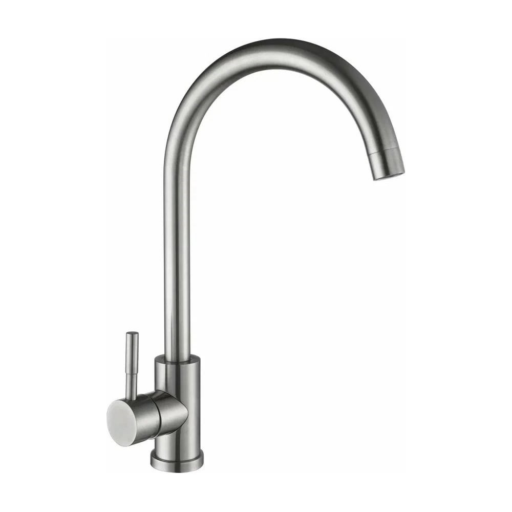 Смеситель для кухни АНТЕЙ®, серия Булат - Корпус: нержавеющая сталь (SUS 304) - Цвет: сатин - Картридж: ø35 мм, с керамическими пластинами - Излив: высокий, поворотный - Высота (корпус + излив): 370 мм - Аэратор: пластиковый, съемный, внутр. резьба Ø22мм В комплекте: гибкая подводка ½ дюйма 350 мм – 2 шт., монтажный комплект – гайка.