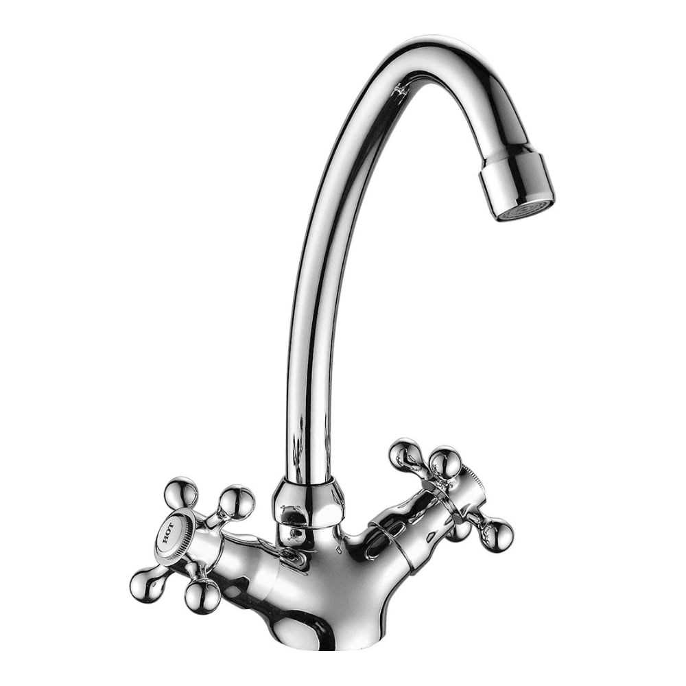 Кухонный смеситель высотой 251 мм изготовлен из прочного цинкового сплава с хромовым покрытием. Оснащён кранбуксами с керамическими пластинами на 90° для плавного и надёжного управления водой. Излив высотой 198 мм обеспечивает удобство при мытье посуды. В комплекте гибкая подводка длиной 450 мм и крепёж-шпилька для простой установки.