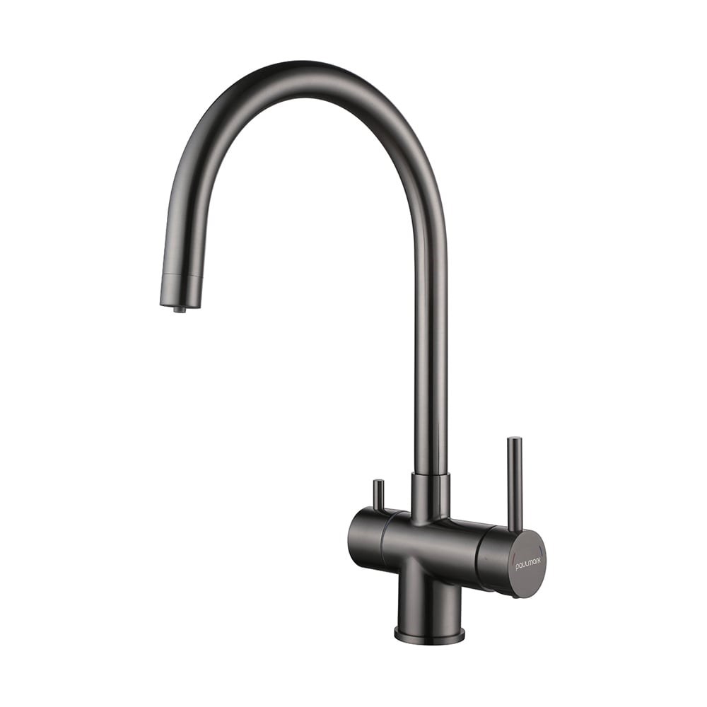 Смеситель для кухни Heller He213218-GM с возможностью подключения фильтра питьевой воды. Изготовлен из высококачественной и экологически чистой нержавеющей стали AISI 304, легированной никелем, марганцем, медью и хромом, что обеспечивает ей повышенную прочность и устойчивость в коррозионных средах. Водопроводная вода и питьевая подаются из одного аэратора. Включение питьевой воды осуществляется отдельной ручкой. В конструкции использован картридж Sedal с керамическими пластинами. Цвет GM имеет дополнительное защитное покрытие PVD, устойчивое к появлению царапин и истиранию. Комплектация включает в себя запасной пластиковый аэратор, а так же комплект гибкой подводки длинной 60 см, крепление с облегченной установкой (гайка на втулке). Гарантийный срок на смеситель Paulmark 5 лет