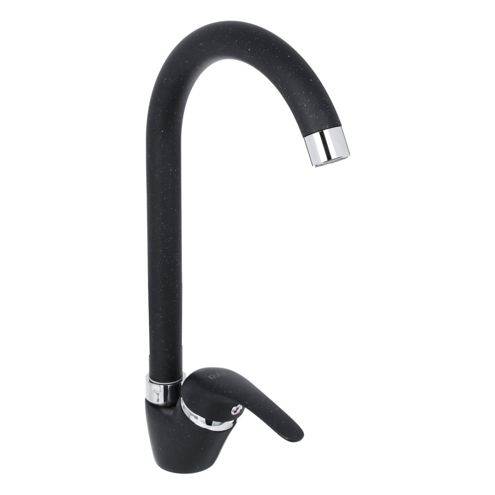 Смеситель для кухни RAIN «Веста» с высоким изливом – идеальное решение для современной кухни. Высокий излив позволяет комфортно мыть посуду и продукты, а также набирать воду. Черный цвет с фактурой «под гранит» смотрится оригинально и гармонично вписывается в любой интерьерный стиль. Корпус из латуни не боится коррозии, устойчив к протечкам. Надежное покрытие не царапается и легко очищается от налета и брызг. Однорычажное управление позволяет быстро настраивать напор и температуру воды буквально одним плавным движением. Керамический картридж 35 мм работает безотказно. Комплект включает крепеж и гибкую подводку 50 см. Гарантия – 7 лет.