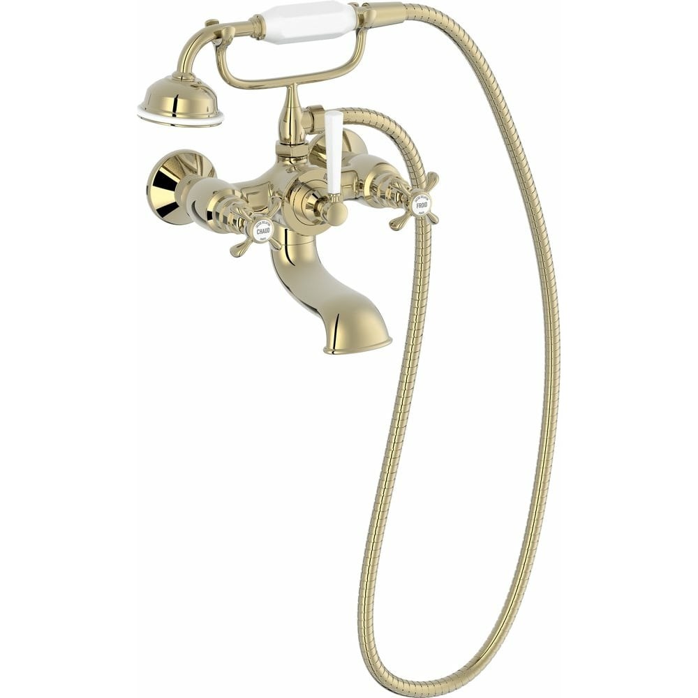 Смеситель для ванны JACOB DELAFON CLEO 1889 бежевое золото 00000086359 E24313-BGG выполнен в стиле ретро. В этой модели сочетаются благородство классических линий и достижения последних технологий. PVD-покрытие обеспечивает защиту от царапин и повреждений в течение 25 лет. Широкий носик излива обеспечивает быстрое наполнение ванны. Уникальный ламинарный аэратор позволяет создать витую струю с хорошим потоком и эффект газированной воды. Скорость расхода воды при использовании излива 25 литров в минуту, при включении лейки ручного душа 9 литров в минуту.