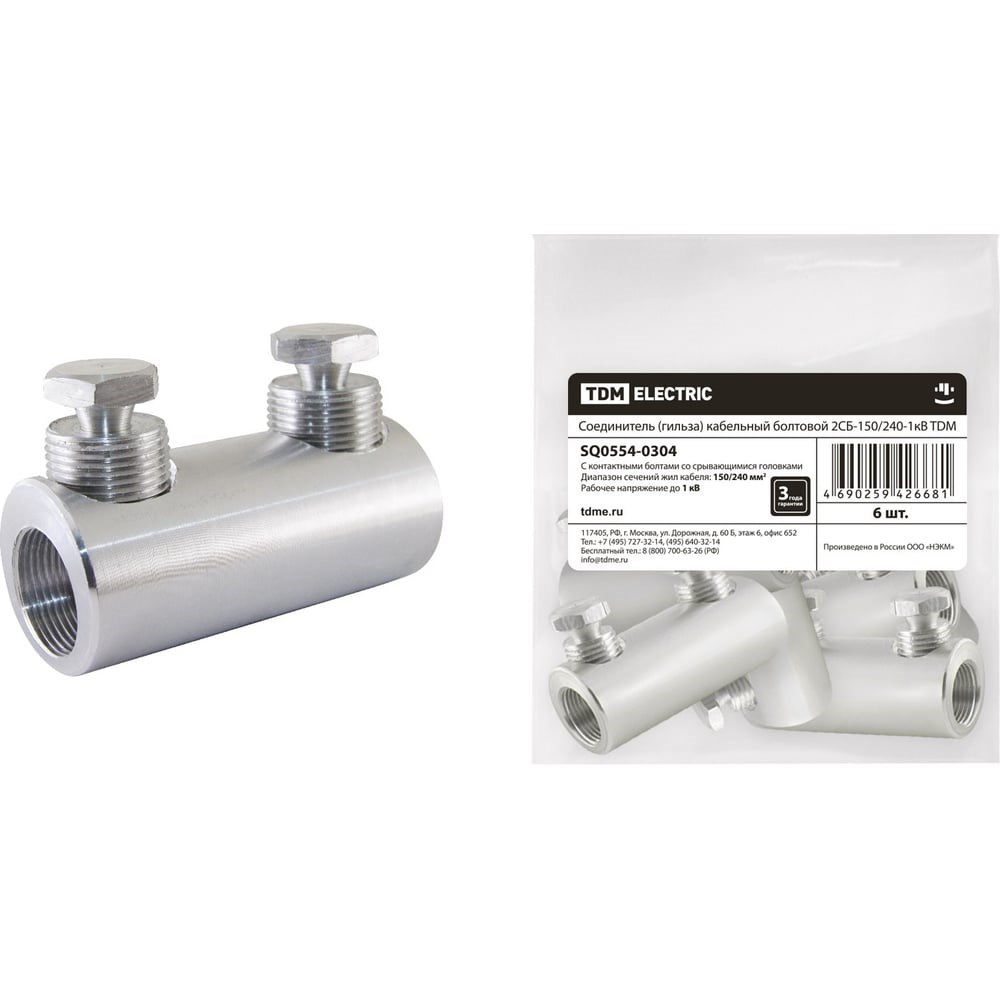 Внимание! Фото товара является условным, при выборе ориентируйтесь на технические характеристики. Дополнительные технические характеристики соединителя TDM ELECTRIC 2CБ-150/240-1кВ SQ0554-0304: Для кабелей и проводов на напряжение до 1 кВ. Позволяют соединять жилы кабелей любого типа: алюминиевые и медные; круглые и секторные; с многопроволочными и моно жилами. Резьбовая накатка на внутренней поверхности отверстия для кабельной жилы увеличивает площадь контакта и механическую прочность соединения. Применение для крепления жилы контактных болтов со срывающимися головками упрощает монтаж соединителей (гильз). Контактные болты имеют проточки в местах срыва обеспечивающие нормированный момент срыва их головок, что обеспечивает оптимальные электрические и механические свойства контактного соединения. Отверстие для кабельной жилы смещено относительно центра цилиндрической части корпуса наконечника.