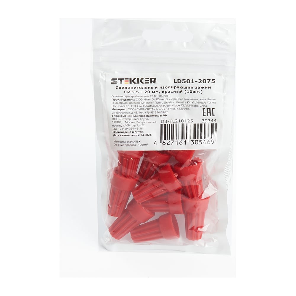 Соединительный изолирующий зажим STEKKER LD501-2075 СИЗ-5 - 20 мм, красный упаковка 10 шт 39344 - быстрый, легкий и безопасный монтаж. Не требует использования специального инструмента и навинчивается на предварительно зачищенные и скрученные концы проводов. Расположенная внутри корпуса пружина конической формы обеспечивает надежную фиксацию скрутки проводов на протяжении всего срока эксплуатации а корпус полностью изолирует соединение. Зажимы могут быть использованы многократно.