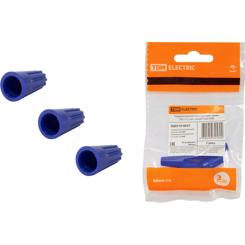 Соединительный изолирующий зажим TDM ELECTRIC СИЗ-2 4,5 мм2, синий, 5 шт. SQ0519-0027 предназначен для электрического соединения, фиксации и изоляции пучка проводов. Зажим накручивают на предварительно зачищенные и соединенные вместе концы проводов в несколько оборотов до упора. Преимущества: корпус СИЗ-Л имеет крылья для увеличения рычага и силы крутящего момента, что облегчает монтаж проводов больших сечений; при монтаже не требуется использование специального инструмента; быстрота монтажа и возможности многократного использования.
