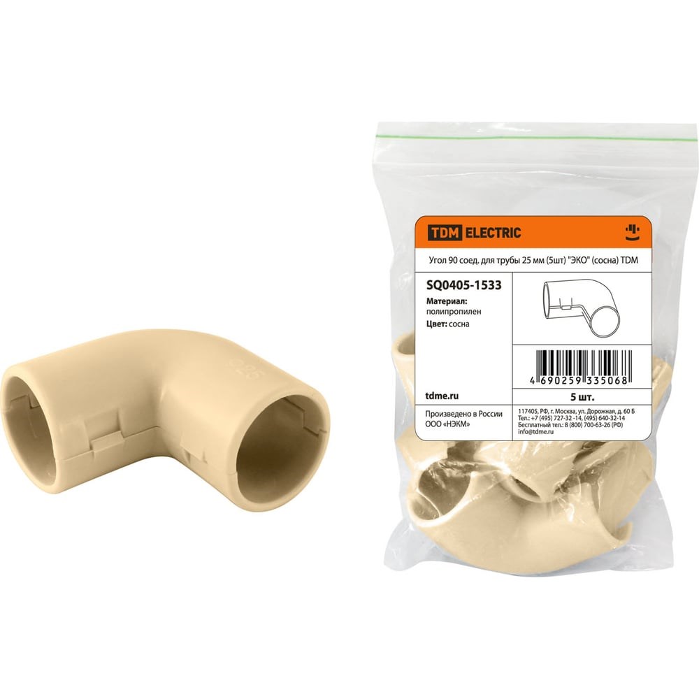 Соединительный угол 90 TDM ELECTRIC для трубы 25 мм, 5 шт., ЭКО сосна SQ0405-1533 предназначен для крепления гофрированных или гладких жестких труб из ПВХ к поверхности стен, потолков, полов или перегородок, для герметичного соединения гладких жестких труб из ПВХ под необходимым углом, для соединения гладкой жесткой трубы из ПВХ с монтажной коробкой или шкафом (щитком) под углом при помощи муфты труба-коробка IP44, для обеспечения дополнительной изоляции кабелей и проводов.