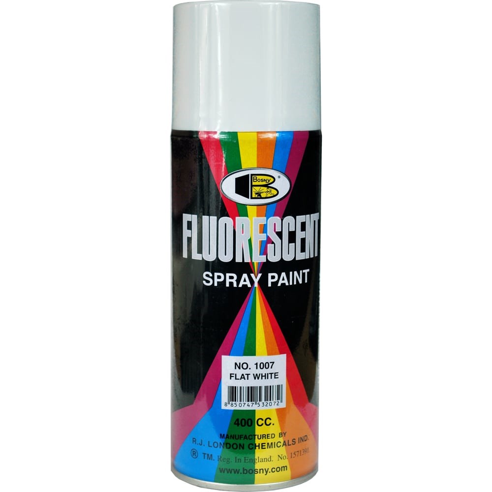 Специальная краска Bosny белый матовый 1007 может применяться на поверхностях из металла, пластика, стекла или дерева. Состав краски содержит флуоресцентный пигмент, который светится при попадании ультрафиолетовых лучей. Хранение неиспользованной краски возможно в перевернутом баллоне.