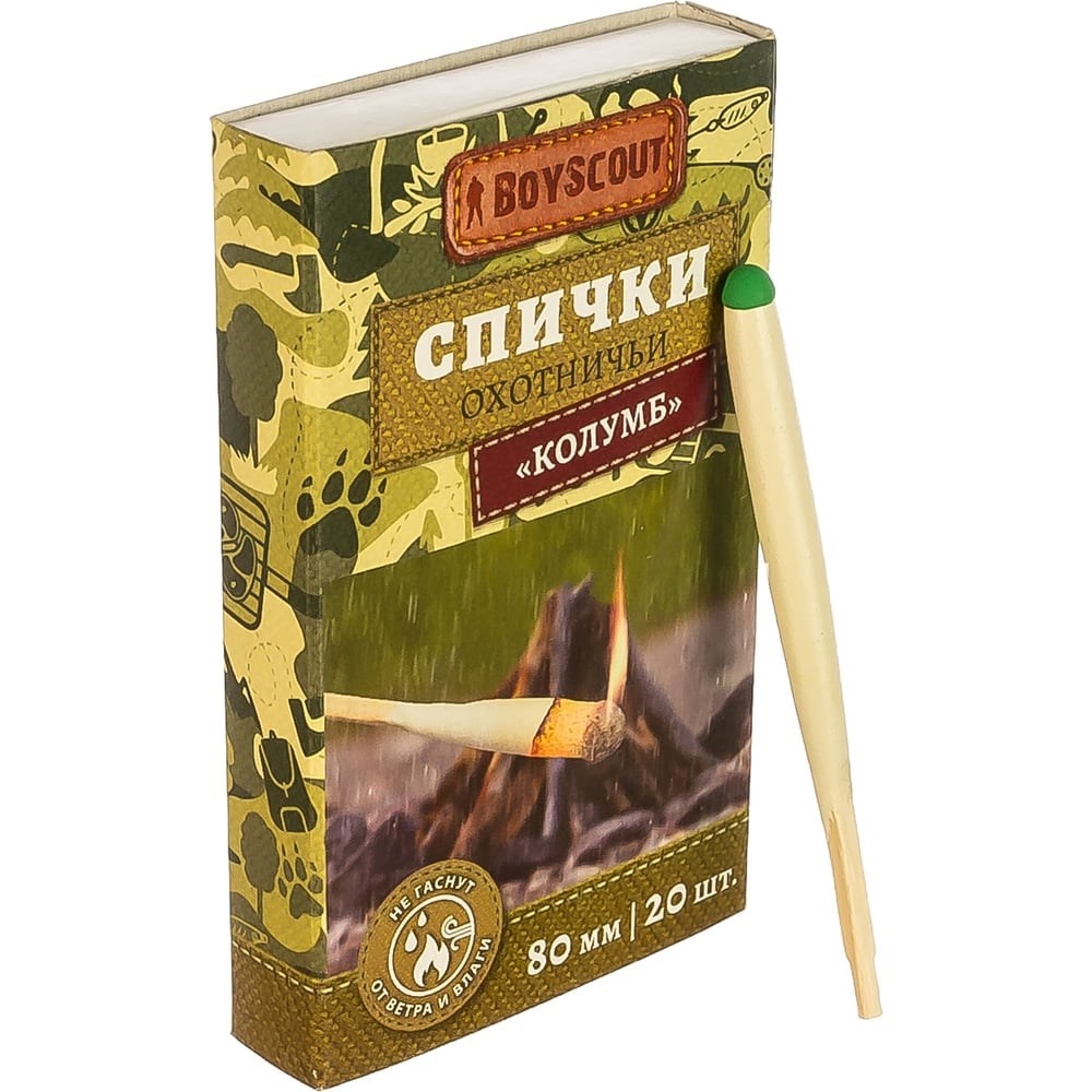Спички BOYSCOUT Колумб 80 мм, 20 шт. не гаснут от ветра и влаги /80/20 61033 помогут разжечь костер в ветреную и дождливую погоду. Пригодятся во время турпохода, рыбалки, охоты, отдыха на природе. Огонь в походе, на рыбалке, охоте или пикнике является одной из важных составляющих, позволяющих обеспечить тепло и защиту. Поэтому спички и зажигалки должны быть в каждом рюкзаке, даже если вы не планируете ночевку в лесу. Спички «Колумб» горят даже после погружения в воду, а также гарантируют получение пламени при сильном ветре и дожде.
