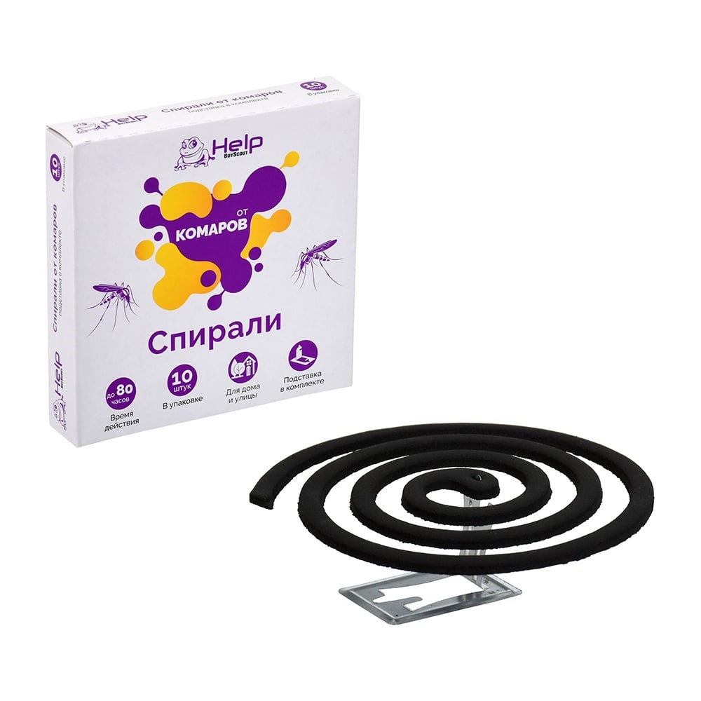 Спирали от КОМАРОВ 10 шт HELP 80230 включают действующее вещество аллетрин. Спирали - популярное и эффективное средство для защиты от летающих насекомых на открытом воздухе. Идеальны для использования на дачах, верандах, в беседках. При сгорании спирали, действующее вещество попадает в воздух и убивает комаров, мошек, москитов. Продолжительность действия до 80 часов. Есть подставка в комплекте.