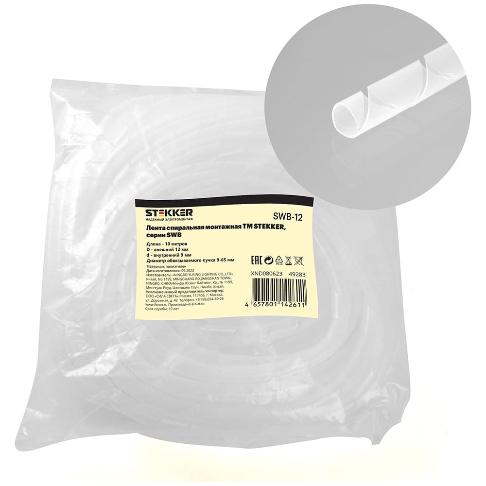Лента спиральная монтажная SWB-12 представляет из себя ленту из полиэтилена, закрученную в спираль, длиной 10 метров. Спираль дает возможность аккуратно скреплять проводку внутри кабельных каналов, металлических лотков и распределительных шкафов. Сферы применения: - вязка и защита кабеля при производстве кабельной продукции, электронной промышленности, в шкафах управления и коммутации; - для эффективной и чистой связки и прокладки кабелей, проводов, кабельных жгутов; - для защиты кабелей от трения или других повреждений, а также для придания жесткости.