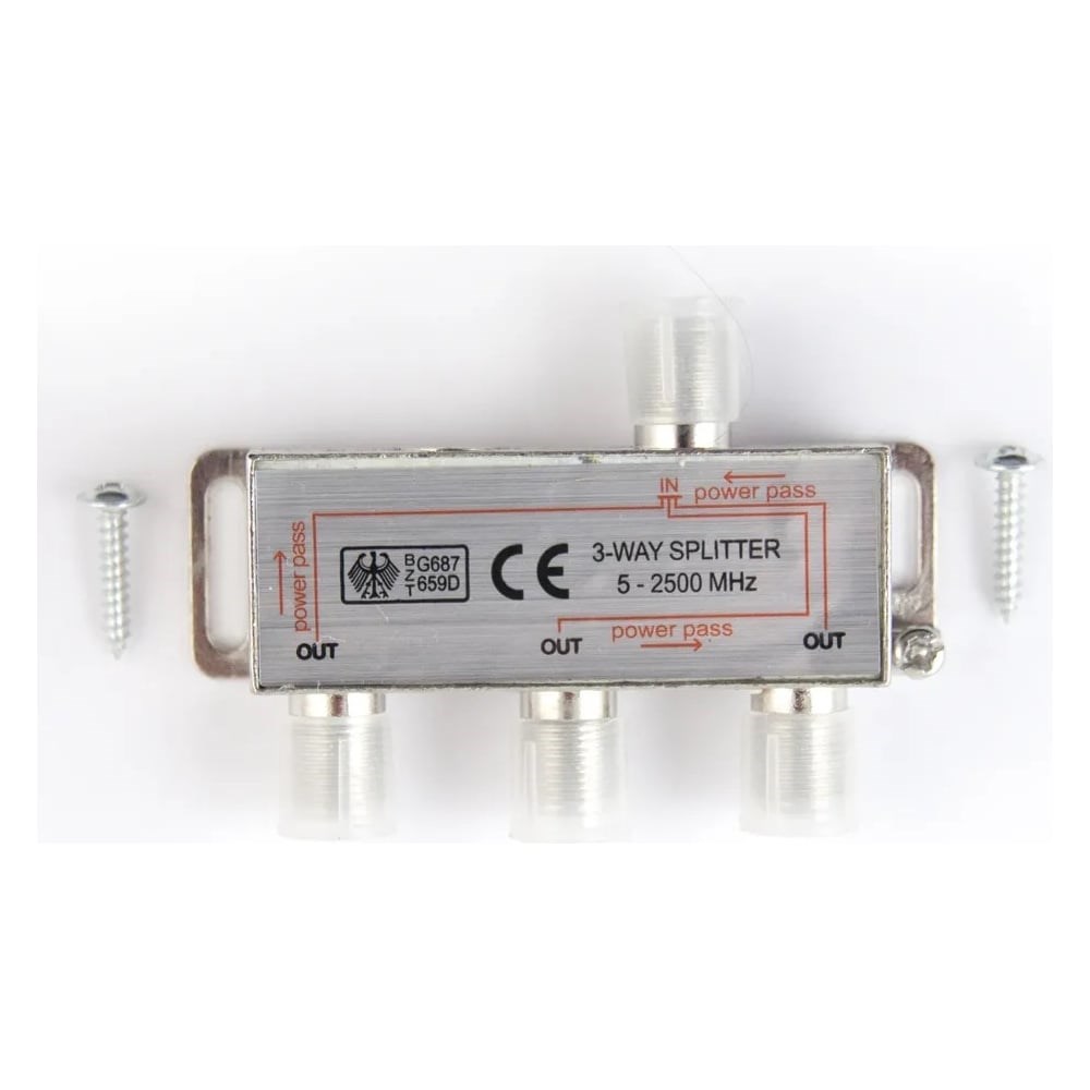 Сплиттер Pro Legend на 3 направления 5-2500 мгц PL1106-2500 с розетками под f-разъемы. Предназначен для разветвления высокочастотных (5-2500МГц) телевизионных (RF/AV/TV) сигналов с одного источника на 3 направления.