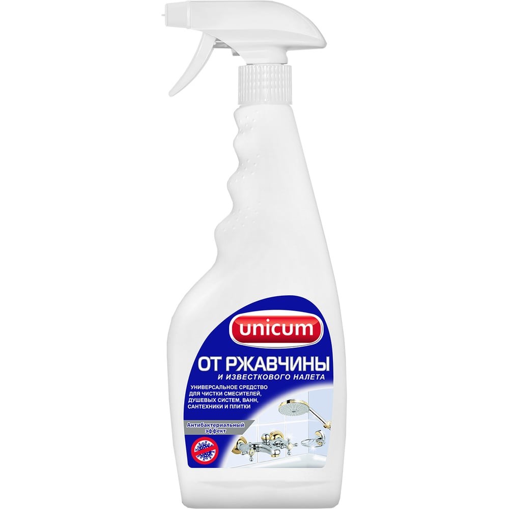 Спрей для удаления известкового налета и ржавчины UNICUM - высокоэффективное средство для чистки и обновления оборудования ванных и туалетных комнат: эмалированной и фарфоровой сантехники, изделий из нержавеющей стали, унитазов, биде, раковин, кафельных покрытий и пластиковых панелей.Средство мгновенно удаляет следы мыла, известковый налет, ржавчину, мочевой камень, плесень и грибок, удаляет неприятные запахи придает блеск и оставляет защитный слой препятствующий последующим загрязнениям.СПОСОБ ПРИМЕНЕНИЯ:Нанести средство с помощью распылителя с расстояния 20-25 см на очищаемую поверхность, подождать 15-20 секунд, протереть щеткой или тряпкой и смыть водой. В случае особо стойких загрязнений — повторить действие, увеличив время обработки до 1 мин