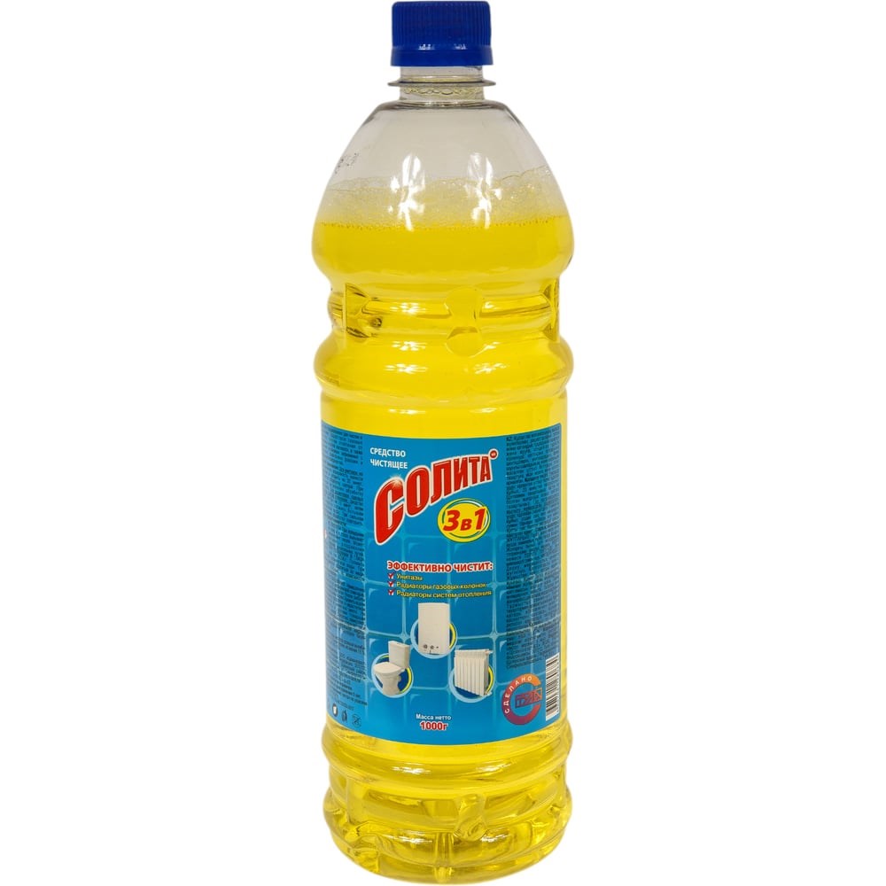 Чистящее средство Солита 3 в 1 1000 г СЛ 1-04 подходит для чистки ванных и кухонных поверхностей. Способ применения: Для унитазов: на загрязненную поверхность нанести средство и оставить на 20 минут. Провести обработку щеткой. При сильном загрязнении обработку повторить. Для радиаторов газовых колонок, систем отопления: средство залить внутрь на 15 минут, затем многократно промыть большим количеством воды. При сильном загрязнении обработку повторить.