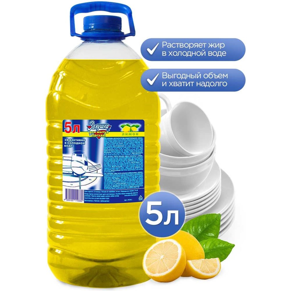 Всего несколько капель средства «Золушка» обеспечат идеальную чистоту Вашей посуды даже при мытье в холодной воде. «Золушка» эффективно растворяет жир и грязь, легко смывается водой. Средство также применяется для мытья окон, облицовочной плитки, сантехники и т.п.Содержит мощные компоненты, которые способны справляться с самой сложной грязью и жиром даже в холодной воде.Формула «Золушки» не содержит агрессивных компонентов, что позволяет использовать его без перчаток, сохраняя вашу кожу рук мягкой и увлажненной.5-литровая упаковка обеспечивает экономичное и длительное использование продукта.Способ применения: нанести небольшое количество средства на губку или на посуду, или растворить 1ч. ложку в 4-5л. воды, ополоснуть посуду водой.