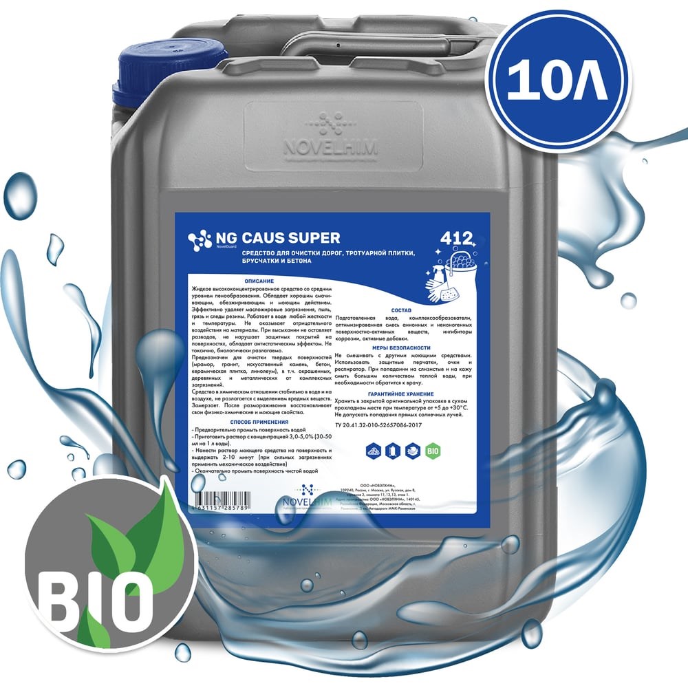 Средство для очистки дорог, тротуарной плитки, брусчатки и бетона NovelGuard ТМ NG Caus Super 412, 10 л 412101 - жидкое высококонцентрированное средство со средним уровнем пенообразования. Обладает хорошим смачивающим, обезжиривающим и моющим действием. Эффективно удаляет масложировые загрязнения, пыль, грязь и следы резины. Работает в воде любой жесткости и температуры. Не оказывает отрицательного воздействия на материалы. При высыхании не оставляет разводов, не нарушает защитных покрытий, обладает антистатическим эффектом. Предназначено для очистки твердых поверхностей (мрамор, гранит, искусственный камень, бетон, керамическая плитка, линолеум), в т ч окрашенных, деревянных и металлических от комплексных загрязнений. Средство в химическом отношении стабильно в воде и на воздухе, не разлагается с выделением вредных веществ.