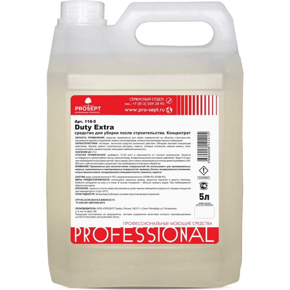 Средство Duty Extra для уборки после строительства 5 л PROSEPT 118-5 предназначен для очистки поверхностей на объектах строительства, при ремонте зданий и сооружений.Применяется для удаления остатков цемента, строительных растворов, извести, солевых отложений, водного камня, клея, затирки для швов, ржавых подтеков, кальциево-карбонатных высолов.Средство применяется так же для мойки и чистки фасадов, полов и стен производственных помещений.Очистка поверхностей Разбавить 10-50 мл/л в зависимости от степени загрязнения. Нанести на поверхность щеткой (губкой, кистью, распылителем, аппаратом высокого или низкого давления). Через 5-10 мин, при необходимости растерев щеткой, смыть водой.Для стойких загрязнений и остатков цемента разбавить 200-500 мл/л, либо использовать концентрат. При необходимости повторить обработку. ВНИМАНИЕ! Оптимальные концентрации и параметры мойки необходимо определять в зависимости от степени и характера загрязнений, типа оборудования и условий мойки.