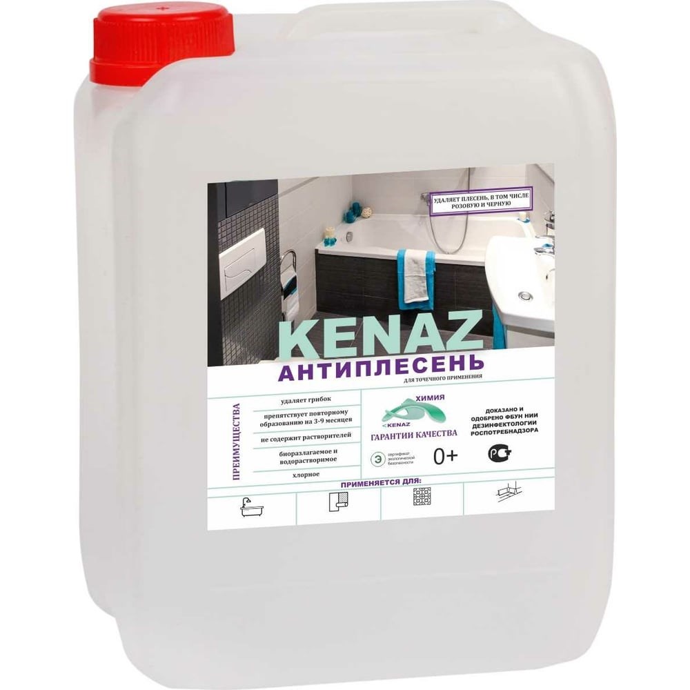 Средство для удаления плесени и грибка КЕНАЗ антиплесень, 5 л 810048 поможет быстро и эффективно удалить все виды плесени (черная плесень, розовая и др.), а также грибы, мхи, водоросли, лишайники. Глубоко проникает внутрь, препятствует повторному образованию на 3-9 месяцев. Можно использовать в сухих и влажных помещениях, в том числе в ванне, бассейне, бане, сауне, душевой и санузлах. Удалитель плесени подходит для обработки смесителей, обоев (плесень на стенах), плитки, штукатурки (плесень на потолке), на деревянных, кирпичных и бетонных поверхностей. Не изменяет цвет и внешний вид обрабатываемой поверхности. Безопасен в применении. Экономичный расход. Инструкция:Проверьте устойчивость поверхности к препарату на незаметном участке. Если результат вас устроит, то обработайте полностью.Механически удалить наросты плесени с поверхности.Смочить поверхность водой.Нанести средство на 40 минут.Смыть.Требует повторного применения вне зависимости от того, удалилась плесень с поверхности или нет (для обеспечения пролонгированного эффекта).ВАЖНО: Использовать на щелочестойких поверхностях. Может менять цвет поверхности, если плесень въелась в нее, а также на окрашенных поверхностях. Избегать попадания на поверхность с золотым, медным, хромированным покрытием. В случае попадания – немедленно смыть большим количеством воды. Использовать перчатки. Имеет сертификат экологической безопасности, что подтверждает 100% биолазлагаемость и смываемость. Можно использовать в домах с септиком.