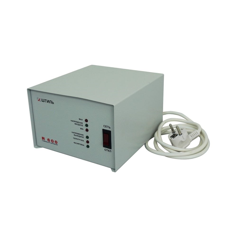 Стабилизатор напряжения "Штиль" R 600 защищает бытовую, офисную и промышленную технику, суммарная электрическая мощность которой не превышает 600 ВА (телевизоры, компьютеры, факсимильные аппараты, офисные АТС и т.д.). При подключении электродвигателей (имеются в составе холодильников, стиральных машин, насосов, компрессоров, моек высокого давления, электроинструмента) с прямым пуском стабилизатор напряжения должен иметь минимум полуторакратный, а лучше трехкратный, запас мощности относительно мощности электродвигателя. Стабилизатор напряжения "Штиль" R 600 выполнен в виде настольного блока с табло индикации и выключателем сети на передней панели, двумя розетками евростандарта и автоматическим предохранителем на задней, для подключения к сети имеется кабель с вилкой евростандарта.
