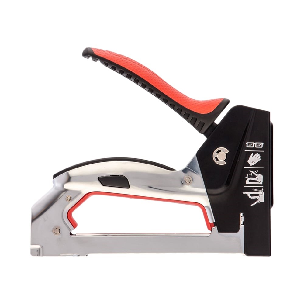 Стальной мебельный степлер Matrix PRO 40916 с механизмом быстрой загрузки скоб позволяет быстро зафиксировать на деревянном основании фанеру, оргалит, ДВП, ДСП, пленку ПВХ или изоляционный материал с помощью скоб 53 размером 6-10 мм. Инструмент используют для обивки или сборки мебели, проведения теплоизоляционных и отделочных работ, укладки ковровых покрытий. Основные особенности: произведен из стали и выдерживает многократное применение без потери работоспособности; имеет механизм быстрой загрузки скоб; рукоятка с противоскользящим покрытием обеспечивает надежное положение во время работы; хромирование поверхности препятствует возникновению коррозии; в комплекте поставляется крючок для подвешивания на ремень. Модель используют в цехах по производству мебели и багетных мастерских.